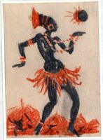 Bailarina negra Representada en este dibujo una bailarina negra, con el cuerpo de frente y su cabeza de perfil, agita su cuerpo al mismo tiempo que sus manos. Lleva algunos adornos como pendientes, collares, brazaletes y sombrero, y una falda de flecos roja. Un pequeño sol eclipsado luce en el cielo. A lo lejos, en el horizonte, se ven figuras humanas y montículos de color anaranjado.Boceto realizado para la ilustración de la revista semanal Novelas y Cuentos. Titulo: Autor: Nº publicado: Fecha: Tomo Nc.: