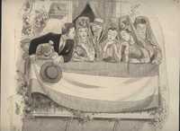 Balcón Andaluz Dibujo a lápiz, que representa la escena de un balcón engalonado con una bandera española, repleto de gente, mujeres vestidas con peineta y mantilla, un caballero hablando con la mujer que está a su lado y rodeando con su brazo a una niña que se apoya en la barandilla del balcón con gesto de enfado.