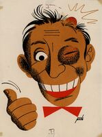 BLANCA POR FUERA ROSA POR DENTRO. En este dibujo firmado solamente se ve la cabeza de un hombre que sonríe dejándose ver sus dientes muy blancos mientras hace un gesto con la mano de buena suerte. Lleva una pajarita roja y tiene heridos su ojo izquierdo y la cabeza en la que sobresale un chichón.Prueba de imprenta. Ilustración realizada para la revista semanal Novelas y Cuentos. Titulo Blanca por fuera Rosa por dentro. Autor: E. Jardiel Poncela. Nº publicado: 1211. Fecha: 25-07-1955. Tomo NC. 53.