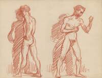 Boceto de dos hombres en diferentes posiciones Apunte a sanguina del desnudo de un hombre en diferentes posiciones, la primera figura de espaldas de pie, y la segunda figura un hombre de frente en aptitud de lucha. La forma del pelo nos induce a pensar de que se trata, en los casos, del mismo personaje, quizá un modelo profesional.
