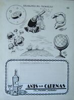 Boceto de Anís las Cadenas Boceto de un cartel donde en la parte superior aparece un letrero que dice “eslabones del progreso”, debajo composición de varios objetos relacionados con Edmundo de la astronomía, y en la parte inferior un recuadro formado por una cadena la imagen de una botella de anís y unas copas junto a unas líneas de donde irá escrita la leyenda.