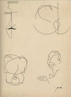 Boceto con líneas Boceto con la composición a base sólo de líneas negras que dibujan diferentes formas, dos de ellas distinguibles, la cara de un caballero con bigote y otro sonriente junto a una mano. Destaca en el ángulo superior derecho, la caricatura de don Pedro Muñoz Seca.