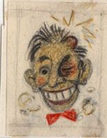 BLANCA POR FUERA ROSA POR DENTRO La imagen de una gran cara con orejas pronunciadas, con una boca enorme mostrando sus dientes muy blancos, con algunos pelillos oscuros, un ojo abierto y otro cerrado, además de un gran chichón en la cabeza es lo representado en este dibujo. La cara tiene un color amarillento y de su barbilla sobresale una pajarita roja.Boceto realizado para la ilustración de la revista semanal Novelas y Cuentos. Titulo: Blanca por fuera rosa por dentro. Ajutor: E. Jardiel Poncela. Nº publicado: 1211 Fecha: 25-07-1954. Tomo NC. 53. PI/. 236.