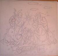 Boceto de un cartel de Navidad Boceto a lápiz de un cartel de Navidad donde debajo de la escena aparece un rótulo donde podemos leer “Felicidades”, dibujo que representa a la Sagrada Familia, La Virgen María, San José y el niño Jesús en el pesebre, junto al buey y la mula, y la adoración de los pastores, uno de ellos de rodillas ante el niño con aptitud de adoración y el otro pastor de pie con un cordero en sus hombros mirando al niño.