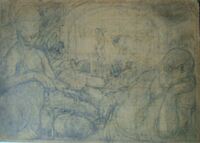 Boceto del espectáculo de una mujer desnuda Primer boceto, con trazos rápidos y sueltos, donde se aprecia en primer término una figura cara al espectador dormida sobre su mano que sujeta la cabeza, y a su lado otra figura de perfil sentada en una silla y detrás de ellas diversas siluetas de espaldas mirando al fondo donde se aprecia un arco con la figura de una mujer desnuda.