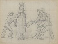 Boceto del picador subiendo al caballo El boceto que representa la escena de un picador apoyado sobre los hombros de un mozo que le ayuda a subir al caballo que a su vez está sujeto por otro mozo. El uno de los bocetos cuadriculados de lo que luego llegaría a ser un cuadro.