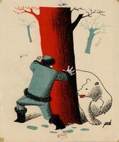 BURLANDO AL DESTINO.                Alrededor de un árbol con el tronco rojo y grueso un oso blanco, del que se ve solamente su cabeza y dos patas delanteras, persigue a un hombre menudo con traje azul y botas, guantes y gorro negro. El dibujo está encuadrado.Boceto realizado para la ilustración de la revista semanal Novelas y Cuentos.  Titulo: Burlando al destino. Autor: L. Staton Paleu. Nº publicado: 1299. Fecha:  01-04-1956. Tomo NC. 44. PI/ 248