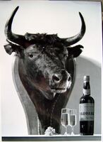 Cabeza de Toro con botella Osborne.                Fotografía en blanco y negro, con una composición de un delicado contraste, donde se representa la cabeza de un toro colgado sobre una pared y, en primer término, sobre el bisel del canto de una mesa, unas copas y una botella Osborne. Una interesante obra para delimitar y concretar los métodos creativos de nuestro artista.