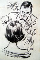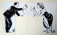 Brindis 2                Con un juego de trazos negros sobre fondo blanco se representa a un hombre, ligeramente inclinado por estar apoyado sobre una barra, levantando su copa a una mujer que está frente a él, sentada en un taburete alto, al que le devuelve el gesto.