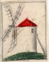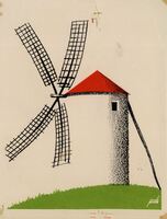 CARTAS DE MI MOLINO. Sobre un monte verde se levanta un molino de paredes blancas y tejado rojo con grandes hélices. El dibujo se encuentra enmarcado.Boceto realizado para la ilustración de la revista semanal Novelas y Cuentos. Titulo: Castas de mi molino. Autor: Alfonso Daudet. Nº publicado: 1259. Fecha: 26-06-1955. Tomo NC.: 46.