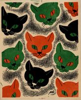 Caras de gatos En este dibujo enmarcado y firmado destacan numerosas caras de gatos de varios colores como el verde, rojo y negro. Entre las caras destaca el color negro.Prueba de imprenta. Ilustración realizada para la revista semanal Novelas y Cuentos. Titulo: Autor: Nº publicado: Fecha: Tomo NC.: