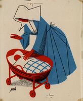 CANCION DE CUNA. Una niñera con un vestido azul y con una toca blanca sobre su cabeza acuna a un bebé que se encuentra en una cuna pequeña de color rojo y con la manta blanca a cuadrados azules. La firma del pintor está presente como se puede ver bajo el dibujo de la cuna en el lado derecho de la composición.Prueba de imprenta. Ilustración realizada para la revista semanal Novelas y Cuentos. Titulo: Canción de cuna. Autor: Gregorio Martínez Sierra. Nº publicado: 1324. Fecha: 23-09-1956. Tomo NC. 43.