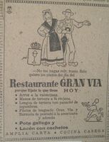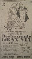 Carta del Restaurante Gran Vía Imagen de un anuncio de prensa, con la figura de una pareja con trajes regionales con zuecos en sus pies, donde la mujer cogida del brazo del hombre le dice que no le haga reír y le cuente que platos del día hay en la carta del restaurante Gran Vía.