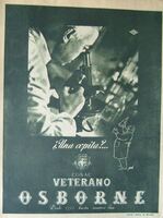 Ciclistas Cartel compuesto sobre un fondo negro con la fotografía de dos ciclista en carrera, debajo la silueta en blanco de un hombre de perfil ofreciéndoles una copita, seguido de los rótulos y leyendas correspondientes a la publicidad del coñac Veterano Osborne.