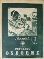 Cartel Veterano Osborne Cartel compuesto por la imagen real de un señor con bata blanca probando con unos auriculares diferentes radios, mientras la silueta trazado con líneas blancas le ofrece animadamente una copa.