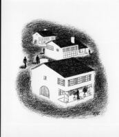 Comunidad de vecinos Imagen con un conjunto de casas, cuyos habitantes se dirigen hacia ellas, en primer término una de ellas donde se aprecia el porche de la casa con una figura negra de un hombre bajando las escaleras.