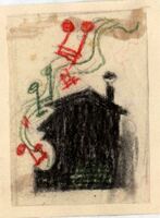 CON EL CUELLO EN LA TRAMPA Una casa de color negro es recortada en su lateral derecho simulando el perfil de un ser humano que canta. Por su boca abierta salen las notas en tonos verdes y rojos como si de una humareda se tratase. El dibujo está ligeramente enmarcado.Boceto realizado para la ilustración de la revista Novelas y Cuentos. Titulo: Con el Cuello en la Trampa. Autor: Elisabeth Ferrrars. Nº public.: 1048. Fecha: 12-06-1951. Tomo NC.: 54. PI/. 114