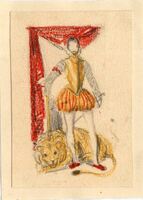 D. JUAN DE AUSTRIA ( EL CAUDILLO DE LEPANTO). Como si de un retrato se tratase se ha representado a un aristócrata en pie con los brazos caídos a lo largo del cuerpo con sus pantalones abombados de color amarillo al igual que la chaqueta, con sus medias blancas y zapatos rojos. A sus pies, más atrás, un león amarillo le acompaña. Como escenario de fondo destaca una gran cortina roja cogida elegantemente al estilo palaciego.Boceto realizado para la ilustración de la revista semanal Novelas y Cuentos. Titulo: D. Juan de Austria (El Caudillo de Lepanto). Autor: J. Martinez Sierra. Nº publicado: 1117. Fecha: 05-10-1952. Tomo NC. 31.