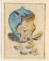 DE INCLUSERO A MILLONARIO. Sobre fondo cuadriculado y enmarcado se aprecia el dibujo de una hucha azul y amarilla, rota, de la que salen margaritas, en vez de dinero, como si quisiera decir que la verdadera riqueza proviene de la belleza.Boceto realizado para la ilustración de la revista semanal Novelas y Cuentos. Titulo: De inclusero a millonario. Autor: Victor Cherbouliez. Nº publicado: 954. Fecha: 21-08-1949. Tomo NC.: 17.