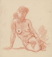 Desnudo a sanguina de una mujer El dibujo es un estudio de un desnudo realizado a sanguina. La mujer está dibujada de frente, sentada en el suelo, en una cómoda posición de modelo: ni la cara, ni las manos (los pies ni siquiera están dibujados) están precisados, lo que demuestra el carácter de rápido esbozo de la obra.