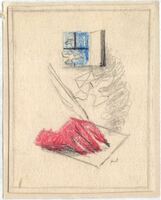 DESDE MI CELDA. Sobre fondo claro se aprecia en el dibujo una mano rosácea cogiendo una pluma preparándose para escribir sobre una hoja en blanco. A lo lejos se abre una ventana dejando percibir la luz del día mediante un intenso azul. El pintor ha firmado su dibujo.Boceto realizado para la ilustración de la revista semanal Novelas y Cuentos. Titulo: Desde mi celda. Autor: Gustavo Adolfo Bécquer. Nº publicado: 1248. Fecha: 10-04-1955. Tomo NC.: 27.