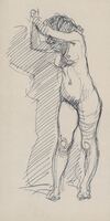 Desnudo de mujer con los brazos en alto Apunte del desnudo de una mujer de frente al espectador. La extraña postura de la joven se debe, no a que esté haciendo el amago de golpear en algún objeto, sino a que se está apoyando con las dos manos en una de las cuerdas utilizadas en los estudios de dibujo para facilitar el aguante de los modelos en posturas más complicadas mientras los estudiantes los dibujan.