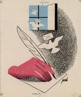 DESDE MI CELDA. En esta composición firmada destaca en primer plano una mano con el tono de piel rosado escribiendo con una pluma sobre un papel blanco. Por una ventana que deja entrever un fondo azul salen palomas blancas llevando en su pico sobres blancos.Prueba de imprenta. Ilustración realizada para la revista semanal Novelas y Cuentos. Titulo: DCesde mi celda. Autor: Gustavo Adolfo Becquer. Nº publicado: 1248. Fecha: 10-04-1955. Tomo NC. 29.