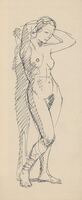 Desnudo de mujer Precioso apunte del desnudo de una mujer de frente al espectador, con los brazos apoyados en la cabeza perfilando las sombras con rayas paralelas. El movimiento de la figura está perfectamente conseguido con unas poquísimas líneas de contorno.