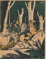 El ataque del tigre En este dibujo firmado, como se puede ver en la parte superior, dos jinetes y sus caballos, uno blanco y el otro marrón, son atacados por un tigre que se lanza sobre ellos. A su alrededor destacan grandes árboles y matorrales verdes. El tigre es abatido por el segundo jinete.Prueba de imprenta. Ilustración realizado para la revista semanal Novelas y Cuentos. Titulo: Autor: Nº publicado: Fecha: Tomo NC.: