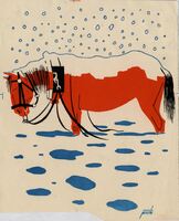 EL AMO Y EL SERVIDOR. En un paisaje nevado donde destaca el color blanco y azul destaca un caballo rojo de perfil sobre el que cae la nieve, en forma de copos azules, dejando su lomo blanco. En la composición se vislumbra la firma del pintor.Prueba de imprenta. Ilustración realizada para la revista semanal Novelas y Cuentos. Titulo: El amo y El servidor. Autor: León Toltois. Nº publicado: 1205. Fecha: 13-06- 1954. Tomo NC.: 44