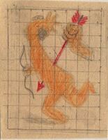 El amor triunfante En una superficie cuadriculada y en un dibujo enmarcado se ha representado a un conejo amarillo corriendo con una flecha roja en la boca.Boceto realizado para la ilustración de la revista semanal de Novelas y Cuentos. Titulo: El amor triunfante. Autor: Rene Bazin. Nº publicado: 1254. Fecha: 22-05-1955. Tomo NC.: 34.