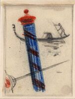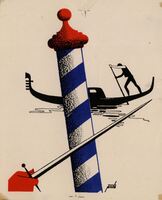 El BRAVO. En primer plano se vislumbran una mano que sostiene una espada y una columna decorada con líneas blancas y azules con el tejadillo rojo. En segundo plano se ve la figura en negro de un gondolero conduciendo su barco. En el dibujo está presente la firma del pintor.Prueba de imprenta. Ilustración relizada para la revista semanal Novelas y Cuentos. Titulo: El Bravo. Autor: Fenimore Cooper. Nº publicado: 1219. Fecha: 19-09-1954. Tomo NC. 59.