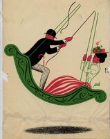 El balancín verde Un hombre y una mujer, sentados cada uno en un extremo del balancín verde, se balancean. Él lleva un traje negro y gris y sombrero mientras que ella lleva una falda blanca con rayas rosas y un corpiño verde, también lleva un sombrero de flores sobre su cabeza. Las dos figuras se hallan de perfil. La composición está firmada.Prueba de imprenta. Ilustración realizada para la revista semanal de Novelas y Cuentos. Titulo: Autor: Nº publicado: Fecha: Tomo NC.