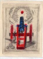 El BLOQUEO. Un cañón azul sobre un soporte rojo es visto por su parte trasera mientras ha lanzado una bomba de color rojo por los aires como puede verse en segundo plano y envuelta en una humareda gris y negra. El dibujo está firmado.Prueba de imprenta. Ilustración realizada para la revista semanal Novelas y Cuentos. Titulo: El bloqueo. Autor: Erckmann Chatrian. Nº publicado: 1256. Fecha: 11-03-1956. Tomo NC. 51.