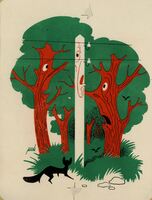 EL BOSQUE ANIMADO. En el centro de este dibujo firmado por su artista destaca un paisaje configurado por árboles de largos troncos marrones y frondosas copas verdes, a los que se ha representado con atributos humanos como boca, nariz y ojos. En primer plano se vislumbra, igualmente con atributos humanos, un poste de cables eléctricos y un gato negro.Prueba de imprenta. Ilustración realizada para la revista semanal Novelas y Cuentos. Titulo: El bosque animado. Autor: W. Fernández Flórez. Nº publicado: 1181. Fecha: 27-12-1953. Tomo NC.: 30 / 59.
