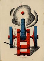 El BLOQUEO Apoyado en su base de madera roja un cañón azul dispara hacia el horizonte. A su lado una mecha de fuego en blanco y negro lo enciende. A lo lejos, envuelta en humareda, se vislumbra el disparo en forma de bola de acero rojo. El dibujo se encuentra enmarcado.Boceto realizado para la ilustración de la revista semanal Novelas y Cuentos. Titulo: El Bloqueo. Autor: Erckmann Chatrian. Nº publicado: 1296. Fecha: 11-03-1956. Tomo NC. 51