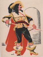 El caballero español Sobre un fondo claro en el que se aprecia, en segundo plano, la simulación de una puerta en tonos grises se nos muestra, en primer plano, un caballero español blandiendo su espada. Lleva una larga túnica roja, calzas negras y en su corpiño, en sus zapatos y en su sombrero con pluma destaca el color amarillo. Sus cabellos son negros y en su rostro se observa un gran mostacho, igualmente negro. La figura está de frente mientras que su cabeza está de perfil. La firma del pintor se puede ver al lado de la bota derecha del personaje.Prueba de imprenta. Ilustración realizada para la revista semanal Novelas y Cuentos. Titulo: Autor: Nº publicado: Fecha: Tomo NC.: