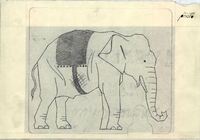 El elefante con una manta de montar sobre su lomo Sobre un fondo gris se ha dibujado enmarcando a un elefante de perfil, grande y gris llevando sobre su lomo una manta negra para montarlo. En la parte superior se destaca la firma del pintor.