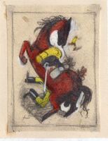 EL ESPIA DEL EMPERADOR. La figura que se representa se trata de un caballo en tonos castaños muy oscuros llegando a parecer rojizos, con una silla amarilla. Su actitud de rebeldía se vislumbra en un movimiento desenfrenado y en la figura de un jinete bajo el caballo del que sólo se ven sus piernas cubiertas por un traje amarillo. El dibujo está enmarcado. Arriba al fondo a la dere3cha se vislumbra una figura corriendo.Boceto realizado para la ilustración de la revista Novelas y Cuentos. Titulo: El Espía del Emperador. Autor: Charles Laurent. Nº public.: 1146. Fecha: 26-04-1953. Tomo NC.: 41. PI/.