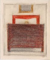 EL ENFERMO La escena parece ocurrir en un dormitorio que se compone de una cama con los respaldos de color rojo en la que se ve apenas una figura con cabellera amarilla apoyada en un gran almohadón blanco. Sobre la cama un cuadro con marco amarillo y de fondo grisáceo. Otra vez el dibujo es enmarcado.Boceto realizado para la ilustración de la revista Novelas y Cuentos. Titulo: El Enfermo. Autor: Azorín. Nº public.: 1264. Fecha: 31-07-1955. Tomo NC.: 44. PI/. 263