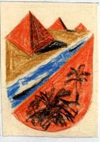 El escudo En un escudo dividido en tres franjas se representa: en la parte superior un paisaje con arenas amarillas y tres pirámides rojas. En la parte central navega un barco sobre aguas azules y en la última franja con el fondo rojo se han dibujado unas palmaras negras.Boceto realizado para la ilustración de la revista semanal Novelas y cuentos. Titulo: Autor: Nº publicado: Fecha: Tomo NC.: