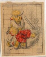 El DRAGON ROJO. En este dibujo enmarcado y con cuadricula se ven dos figuras: una agachada, con la túnica roja y el pantalón amarillo, con las manos en la espalda mientras otra en pie detrás con traje y sombrero amarillo se las ata. El acero de una espada se deja ver en este dibujo al igual que se puede percibir la presencia del boceto de la firma del pintor.Boceto realizado para la ilusgtracion de la revista semanal Novelas y Cuentos. Titulo: El dragon rojo. Autor: Lewis Stanton Paleu. Nº publicado: 1191. Fecha: 17-03-1954. Tomo NC.: 41.