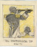 El emperador de Haiti En el dibujo enmarcado sobre un fondo amarillo se representa a un hombre con su traje militar de chaqueta azul y pantalón blanco mirando por un catalejo. En el mismo dibujo se ve la cabeza de espalda de otro hombre.Boceto realizado para la ilustración de la revista semanal Novelas y Cuentos. Titulo: Autor: Nº publicado: Fechas: Tomo NC.: