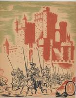 El ejército se encamina a la guerra En un paisaje con los cielos verdes y un castillo de color rojizo y blanco con grandes torres destaca un ejército de caballeros medievales con sus armaduras grises, portando lanzas y sobre sus caballos dirigiéndose a alguna batalla. El dibujo está firmado como se puede ver en la esquina inferior de la derecha.Prueba de imprenta. Ilustración realizada para la revista semanal Novelas y Cuentos. Titulo: Autor: Nº publicado: Fecha: tomo NC.: