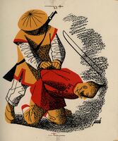 EL DRAGON ROJO. Dos hombres configuran esta escena en la que está presente la firma del pintor: uno de pie ata las manos a otro hombre que está de rodillas. El hombre que está de pie lleva pantalón blanco y por encima una túnica amarilla y el que está de rodillas un pantalón amarillo y una túnica roja. El primero lleva sombrero y una escopeta en la espalda mientras que el segundo no lleva ninguno de estos elementos. A un lado aparece la hoja de una espada, como si se tratase de una ejecución.Prueba de imprenta. Ilustración realizada para la revista semanal Novelas y Cuentos. Titulo: El dragón rojo. Autor: Lewis Stanton Falen. Nº publicado: 1191. Fecha: 07-03- 1954. Tomo NC. 41.
