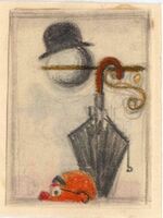 EL ORIGEN DEL PENSAMIENTO. De la parte inferior del dibujo enmarcado se ve una cabeza calva de un hombre con gafas. Por encima de esta figura humana colgado en la pared por medio de una barra marrón hay un paraguas negro, donde también vemos un sombrero sobre una pelota blanca.Boceto realizado para la ilustración de la revista semanal Novelas y cuenos. Titulo: El origen del pensamiento. Autor: Armando Palacios Valdes. Nº publicado: 1354. Fecha: 21-04-1957. Tomo NC. 26.