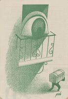 El ojo observador Impresión sobre papel de un dibujo compuesto en tonalidades de verdes, donde observamos en un primer plano un balcón con un gran ojo que mira atentamente como un mozo transporta un baúl sobre sus espaldas.