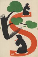 El proceso de Lerouge. Sobre un camino en forma de “S”, de color rojo, caminan dos figuras con hábito negro llevando algo sobre su brazo. Destaca en la composición firmada, hacia la derecha, un árbol con el tronco cortado y con sus hojas verdes.Prueba de imprenta. Ilustración realizada para la revista semanal de Novelas y Cuentos. Titulo: El proceso. Autor: Lerouge. Nº publicado: 888. Fecha: 16-05-1948. Tomo NC. 19.