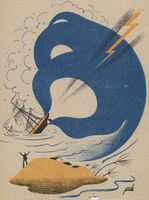 El pirata Surge de las aguas azules del mar una gran mano humana, también azul, que con dos dedos agarra a un barco medio hundido, como se ve en segundo plano. Destaca en el mismo dibujo un hombre sobre una isla de arena pidiendo socorro y, en la parte superior, un trueno amarillo.Prueba de imprenta. Ilustración realizada para la revista semanal de Novelas y Cuentos. Titulo: El pirata; Autor: Walter Scott; Nº publicado: 892; Fecha: 13-06-48;Tomo NC. 03 - Revista: Si