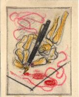 EL RELATO DE UN MUERTO. En este dibujo enmarcado una mano esquelética de color amarillo con una pluma entre sus dedos se dispone a escribir una carta sobre un papel en blanco. Alrededor ondean líneas de color rojo.Boceto realizado para la ilustración de la revista semanal Novelas y Cuentos. Titulo: El relato de un muerto.Autor: Shieply6 Adans. Nº publicado: 1008. Fecha: 03-09-1950. Tomo NC.: 26.